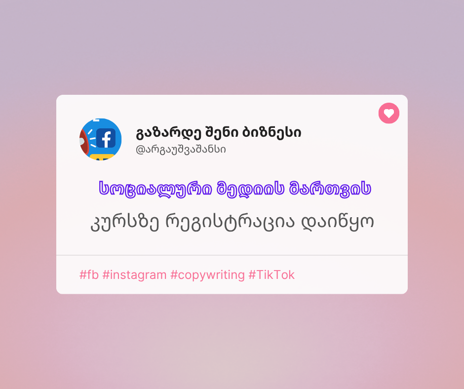 #სოციალურიმედია #სოცმედიაკურსი #ონლაინსწავლა #ციფრულიემარკეტინგი #კრეატიულობამარკეტინგში #ბრენდისმენეჯმენტი #კონტენტმარკეტინგი #სოციალურიმარკეტინგი #ონლაინკურსი #კარიერულიაღმავლობა